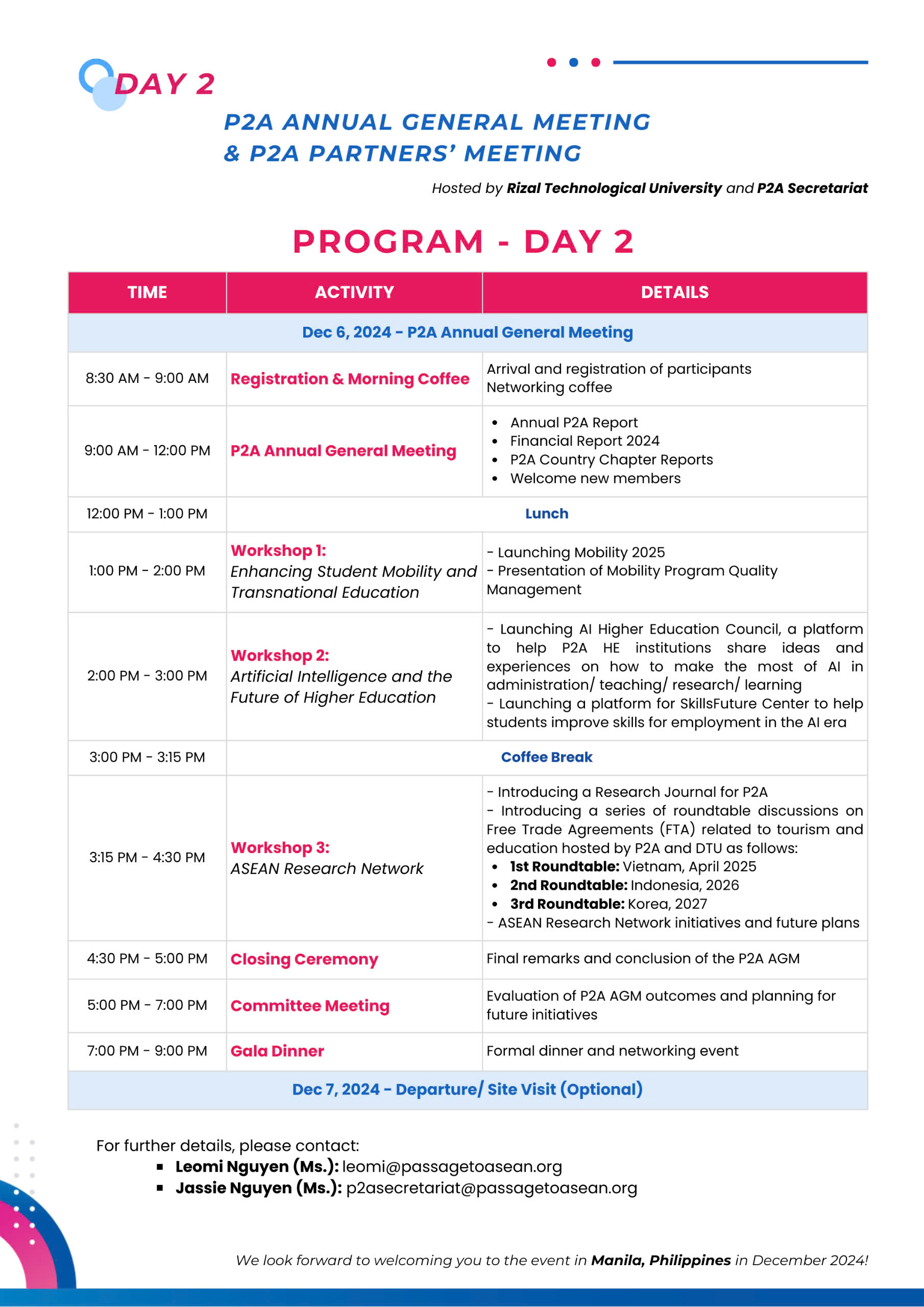 The Passage to ASEAN secretariat (P2A) is delighted to announce its P2A Annual General Meeting (AGM) 2024, scheduled for December 4th to 7th, 2024, in the Philippines, sponsored by Commission on Higher Education of the Philippines (CHED), and co-hosted by Rizal Technological University, Philippines.