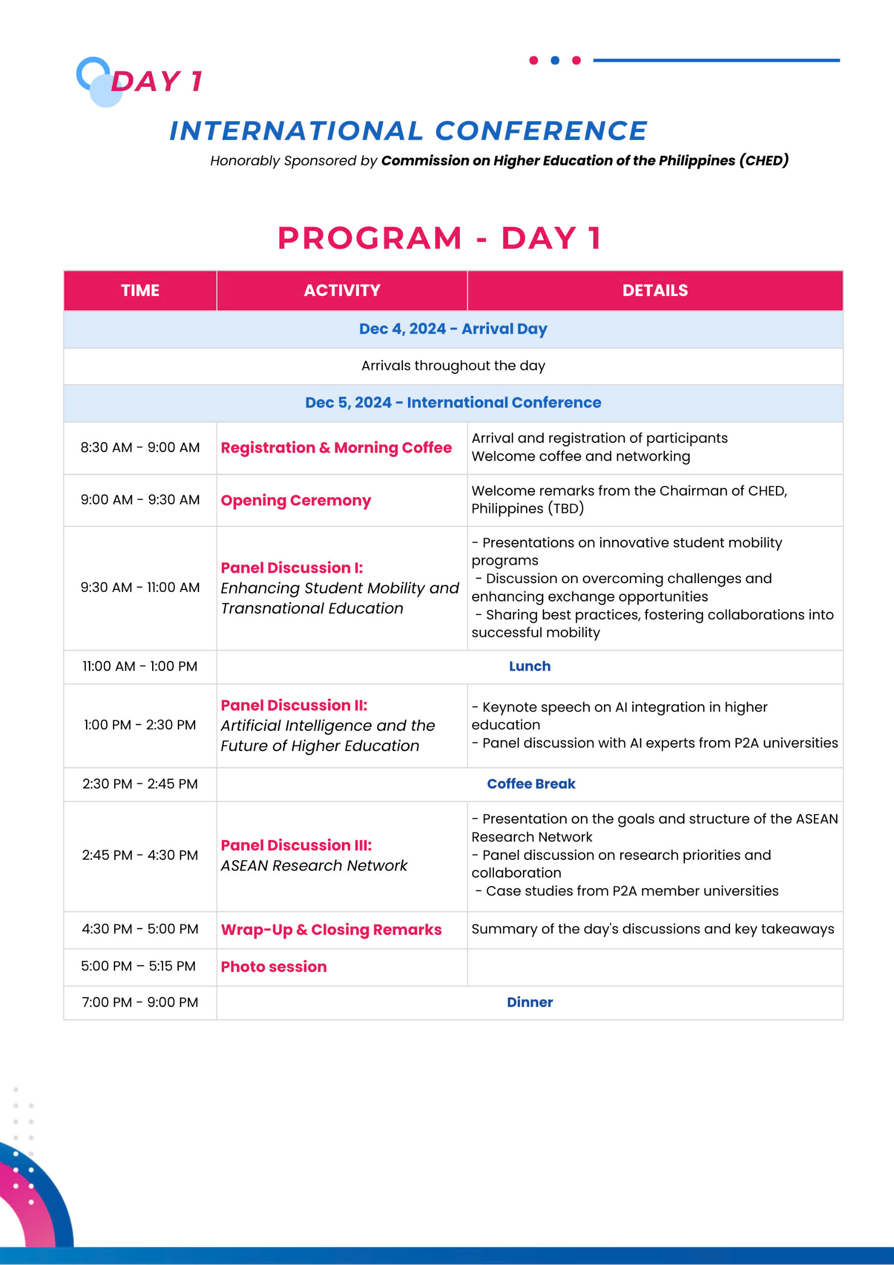 This significant event will bring together representatives from P2A member universities, as well as key stakeholders from the ASEAN region, to engage in meaningful discussions on enhancing regional cooperation in education and research. Spanning two days, the event will feature the P2A international conference, The 8th P2A Annual General Meeting, and 13th P2A partner’s meeting. Esteemed educators, researchers, and policymakers will focus on three core themes: Student Mobility, Artificial Intelligence (AI) in Higher Education, and the ASEAN Research Network (ARN). We extend our heartfelt gratitude to Commission on Higher Education of the Philippines for funding the International Conference program.